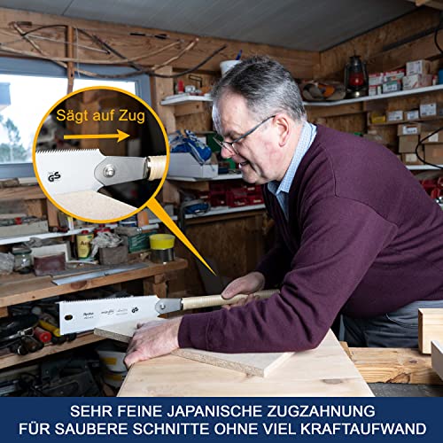 HOCHWERTIGE QUALITÄT: Durch den feinen, dreiseitigen Diamantschliff der Zugzahnung, einem C75 Bandstahl Sägeblatt und einem stabilen Bastgriff aus Esche, erweist sich unsere Handsäge als qualitativ hochwertiger Helfer.