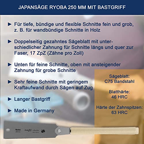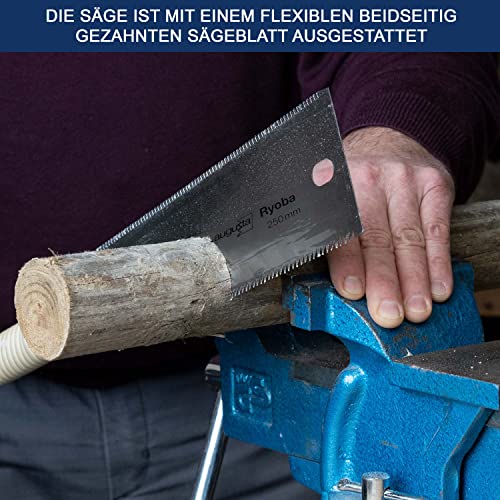 Augusta-Heckenrose Japansäge Ryoba 240 mm I Traditionelle Säge aus Bandstahl C75 für feine & grobe Schnitte I Holzsäge mit flexiblem & beidseitig gezahntem Sägeblatt & Bastgriff
