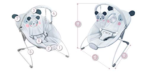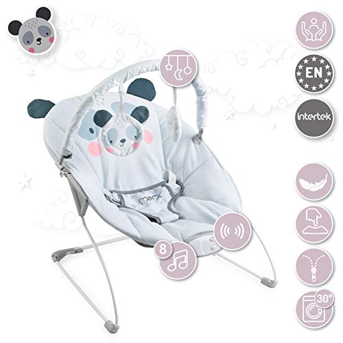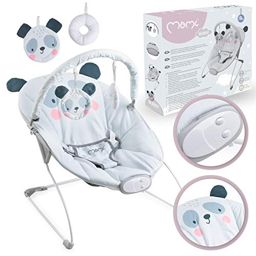 MoMi GLOSSY Babywippe für Babys bis 9 kg weiche Polsterung Metallrahmen Antirutsch Füßchen Haltegurt Abmessungen Sensorisches Modul kreative Kinderförderung, Panda, 58 x 49 x 53 cm