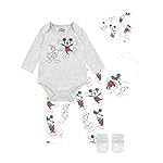 Baby Disney Mickey Mouse Bodysuit-Set. Dieses niedliche Bodysuit zeigt ein graues Oberteil mit einem freundlichen Bild von Mickey Mouse und Donald Duck, mit den Worten „Forever Friends“ in der Mitte. Das Set enthält auch weiße Hosen mit einem Allover-Muster von Mickey und Donald sowie eine passende Mütze mit dem gleichen Print. Das Set enthält auch eine weiße Schürze mit den Worten „Hi There“ und Bildern der geliebten Disney-Charaktere. Um Ihrem Kleinkind von Kopf bis Fuß warm zu halten, enthält das Set auch graue Handschuhe. Dieses Mickey Mouse-Bodysuit-Set ist sicher, ein Lächeln ins Gesicht jedes Mickey- und Donald-Fans zu bringen!