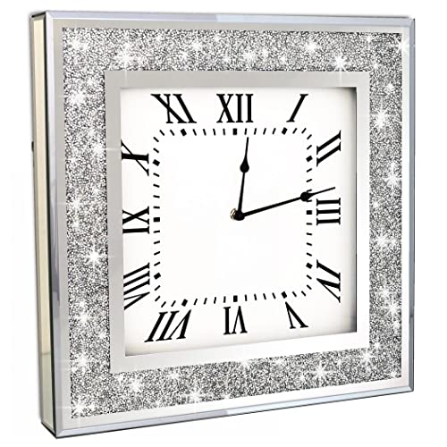Crystal Crush Diamond Mirrored Square Wall Clock with Sparkle Twinkle Bling Diamond Decor for Wall Decoration 406 x 406 cm Decorative Silver Mirror Quartz Clock for Home Decor AA Battery Not Included