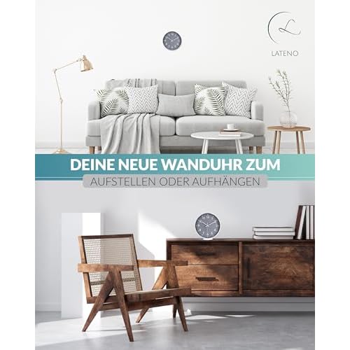 LATENO – Wanduhr zum aufstellen oder aufhängen – grau 30 cm – lautlos – klassisch und modern – Wanduhr ohne tickgeräusche – Wanduhr Modern 2 – Wanduhr grau – Wanduhr Wohnzimmer – Wanduhren
