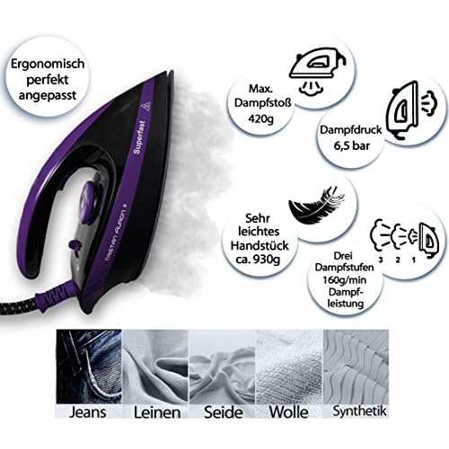 Schreibe die erste Bewertung für „Tristan Auron Dampfbügelstation 6,5 bar Dampfdruck – 2800 W, 420g/Min. Dampfstoß I 1,7L Wassertank, Keramiksohle – Abschaltautomatik (Superfast Lila + Ablage)“