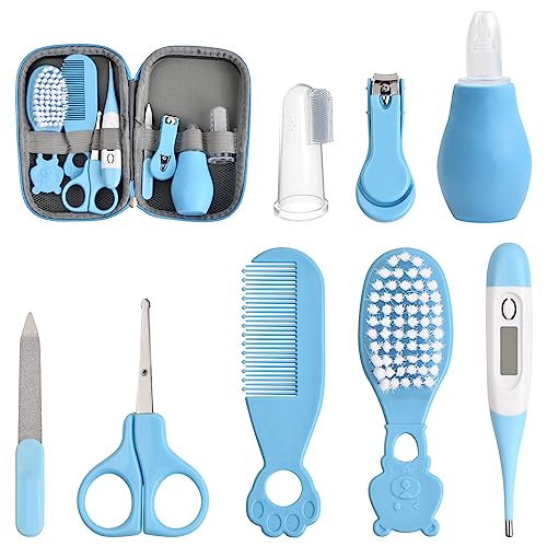 Hoxfly 8 Teiliges Babypflege Set, Tragbares Baby Gesundheits Set, Erstausstattung für Neugeborene, mit Baby Nagelfeile Kamm Bürste Fingerzahnbürste Nagelschneider Schere Nasenaspirator Thermometer