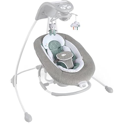 Ingenuity Every Season Swing ’n Go Tragbare Schaukel – Khlende und wrmende Stoffe, abnehmbare nachhaltige Spielzeugstange aus Holz, 2 Spielzeuge, Musik, motorisierte, fr 0-9 Monate, Grau – Wesley