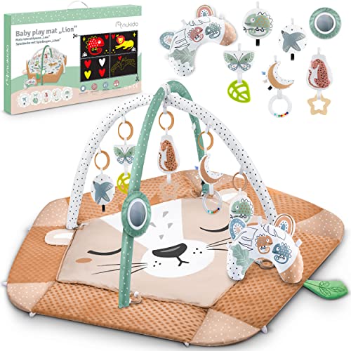 Interaktiv 5in1 Spielbogen Baby Mädchen Junge – Baby Krabbeldecke mit Spielbogen Babies – Baby Spieldecke Play Mat – Activity Decke Spielmatte Baby Schadstofffrei – Löwe Kindermatte XXL Nukido Braun