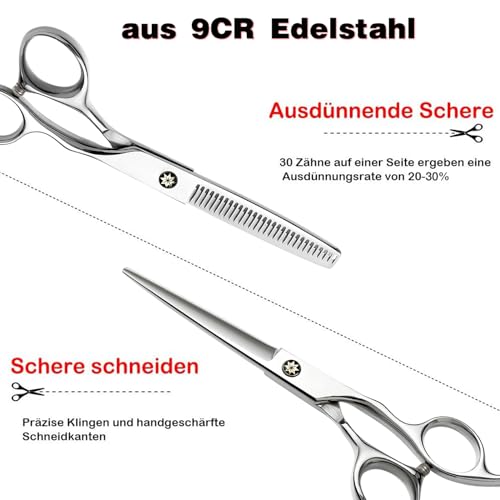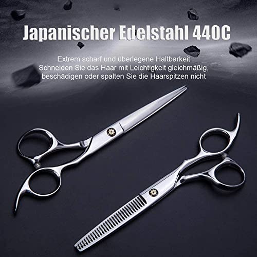 PROFESSIONAL HAIR CUTTING SCISSORS The set includes two scissors, one flat scissors, one dental scissors and a leather case. The blades of the flat scissors are sharp and smooth, making it easy to cut short hair quickly; the tooth tips of the dental scissors are clear and can reduce hair by 20-30%. Evenly.